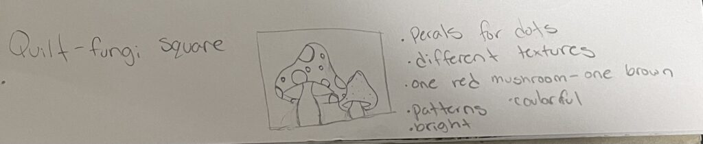 To create my artwork, the first step was finding out which element we would be designing, and mine was fungi. As a class, we then created a checklist that our square had to follow in order to meet the required criteria. After that, I made a plan for how I wanted to design my square, chose the materials I wanted to use, and began creating it. While working on my piece, I faced a few challenges. When sewing, the string would sometimes bunch together and form knots at the end. I worked through this by using shorter pieces of thread to help prevent the knotting. Another challenge was adding the “grass,” which would not stay in the position I wanted. I was not able to fully overcome this issue, and I worry that the pieces might fall out if they are pulled on. Overall, I really liked my artwork because sewing and needlepoint are strengths of mine. The final result turned out better than I expected, and I especially liked using pearls for the mushroom spores. However, I did not like that some of the grass pieces did not work the way I wanted, and there is also a small spot where I accidentally cut the fabric, which might cause the thread to come out. I titled my artwork Enchanted Mushroom Collaborative Quilt Square. Through creating this piece, I learned the importance of not rushing and taking my time, because rushing can make the work look messy and lead to a poorer outcome. If I were to create it again, I would choose smaller pearls because the large ones made it difficult to sew the top since they got in the way.